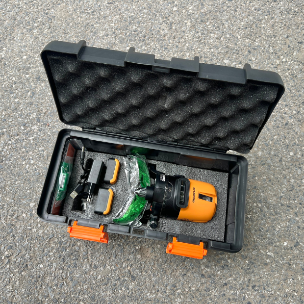 Kích thước máy nhỏ gọn và tiện lợi, trọng lượng của máy nhẹ chỉ nặng 1,2 Kg dễ dàng cho bạn có thể mang theo và sử dụng máy ở mọi lúc và mội nơi một cách tiện lợi. Vỏ máy được làm từ chất liệu cao cấp chắc chắn, chống va đập tốt, bảo vệ tối ưu các linh kiện bên trong. Chân đế được thiết kế linh hoạt, có thể điều chỉnh độ cao và xoay 360 độ, đáp ứng mọi nhu cầu sử dụng. Máy tích hợp hệ thống chống rung hiệu quả, đảm bảo độ chính xác cao khi đo lường trên địa hình gồ ghề cho hiệu quả đo đạc của máy được nâng cao. Khi mua máy máy có đi kèm theo túi đựng máy giúp bảo quản máy an toàn khi di chuyển và có kính bảo hộ bảo vệ mắt khỏi tia laser với mục tiêu giúp định vị tia laser chính xác hơn. Thiết kế với 5 tia laser sáng rõ, bao gồm 1 tia ngang và 4 tia dọc giúp bạn đo đạc hiệu quả.